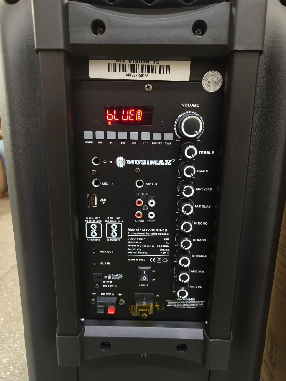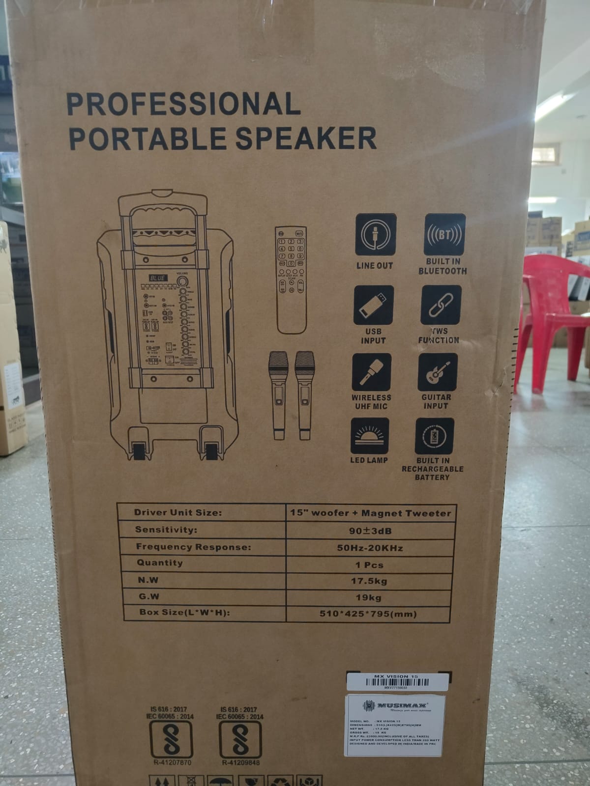 2 PCS METAL UHF,MULTI FREQUENCY, RECHARGEBLE MICROPHONES. 120 WATTS RMS POWER OUTPUT . MICROPHONE ECHO / MIC BASS / MIC TREBLE / DELAY / REVERB CONTROL. 12 VOLT EXTERNAL BATTERY CONNECTORS RGB LED RUNNING LIGHTSRCA INPUT /OUTPUT AUXILIARY IN & AUX OUT GUITAR INPUT WITH CONTROL.